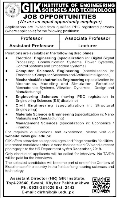GIK Institute of Engineering Sciences & Technology Swabi Jobs 2019 for Teaching Faculty Latest Job Ad shown on this page is taken from Dawn Newspaper on 23-11-2019